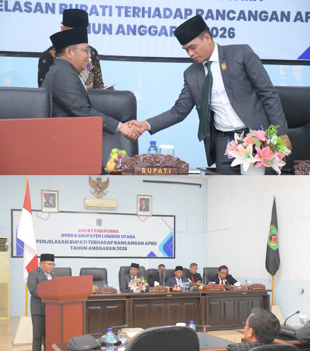 Bupati Lombok Utara Najmul Akhyar menyampaikan penjelasan Rancangan APBD (RAPBD) 2026 dalam sidang paripurna DPRD KLU, Senin (3/11/2025).