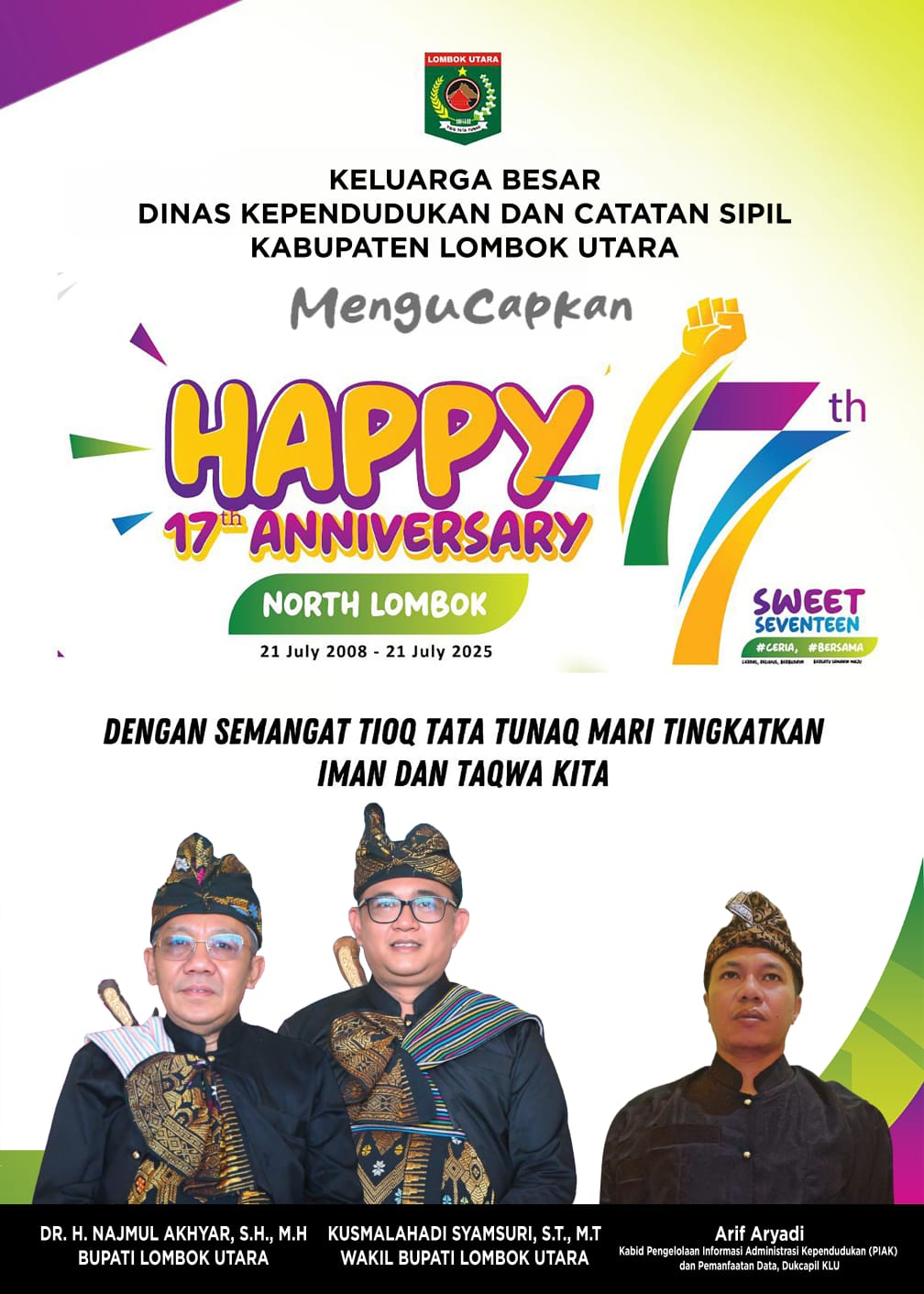 Lombok Utara, Katada.id- Kelurga Besar Dinas Kependudukan dan Catatan Sipil Kabupaten Lombok Utara (KLU) Mengucapkan Happy 17 Th Anniversary North Lombok.(*)