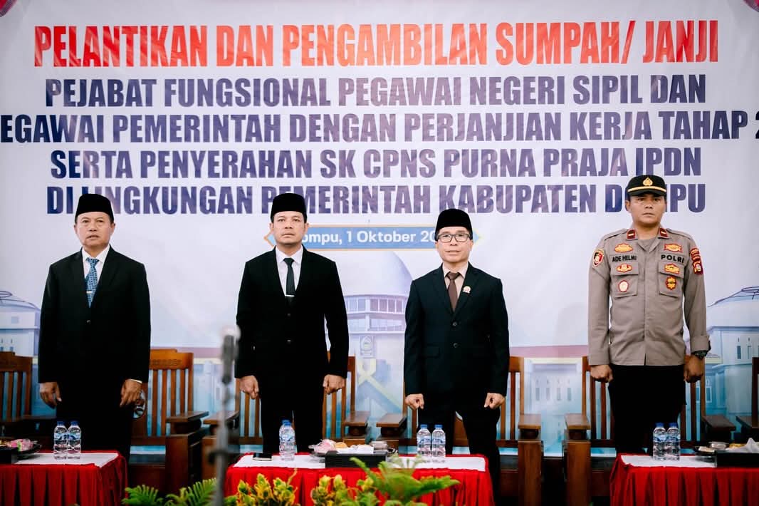 Dompu, katada.id – Sebuah babak baru dalam penguatan aparatur pemerintahan Kabupaten Dompu dimulai. Bupati Dompu, Bambang Firdaus SE, dengan penuh khidmat melantik dan mengambil sumpah jabatan 110 aparatur, yang terdiri dari pejabat fungsional guru, pengawas sekolah, Pegawai Pemerintah dengan Perjanjian Kerja (PPPK) tahap II, serta CPNS Purna Praja IPDN.