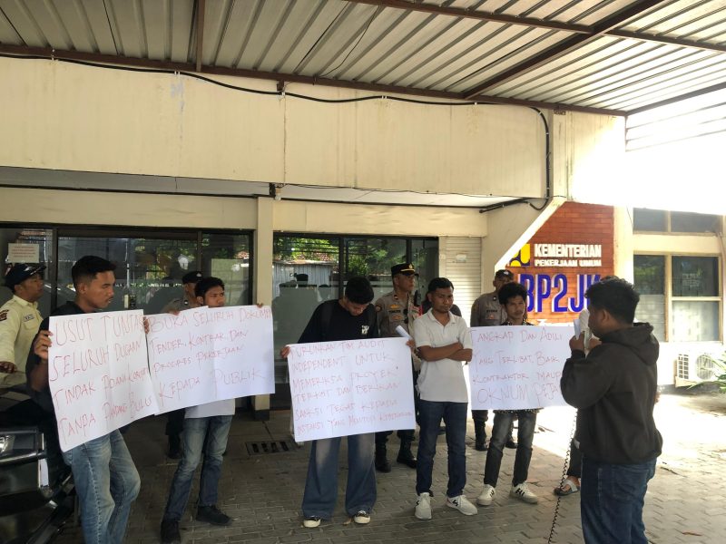 Para demonstran, menuntut pengusutan dugaan penyimpangan pada proyek-proyek strategis APBN yang dikerjakan Balai Besar Wilayah Sungai Nusa Tenggara I (BBWS NT I) danBalai Prasarana Permukiman Wilayah (BPPW NTB) yang proses tendernya dilakukan oleh BP2JK NTB.