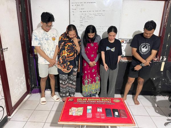 Selain itu, petugas juga mengamankan seorang perempuan wiraswasta berinisial EN (29) dan seorang ibu rumah tangga berinisial DR (30). Kelimanya diamankan berdasarkan dugaan pelanggaran Pasal 114 ayat (1) dan/atau Pasal 112 ayat (1) Undang-Undang RI Nomor 35 Tahun 2009 tentang Narkotika.