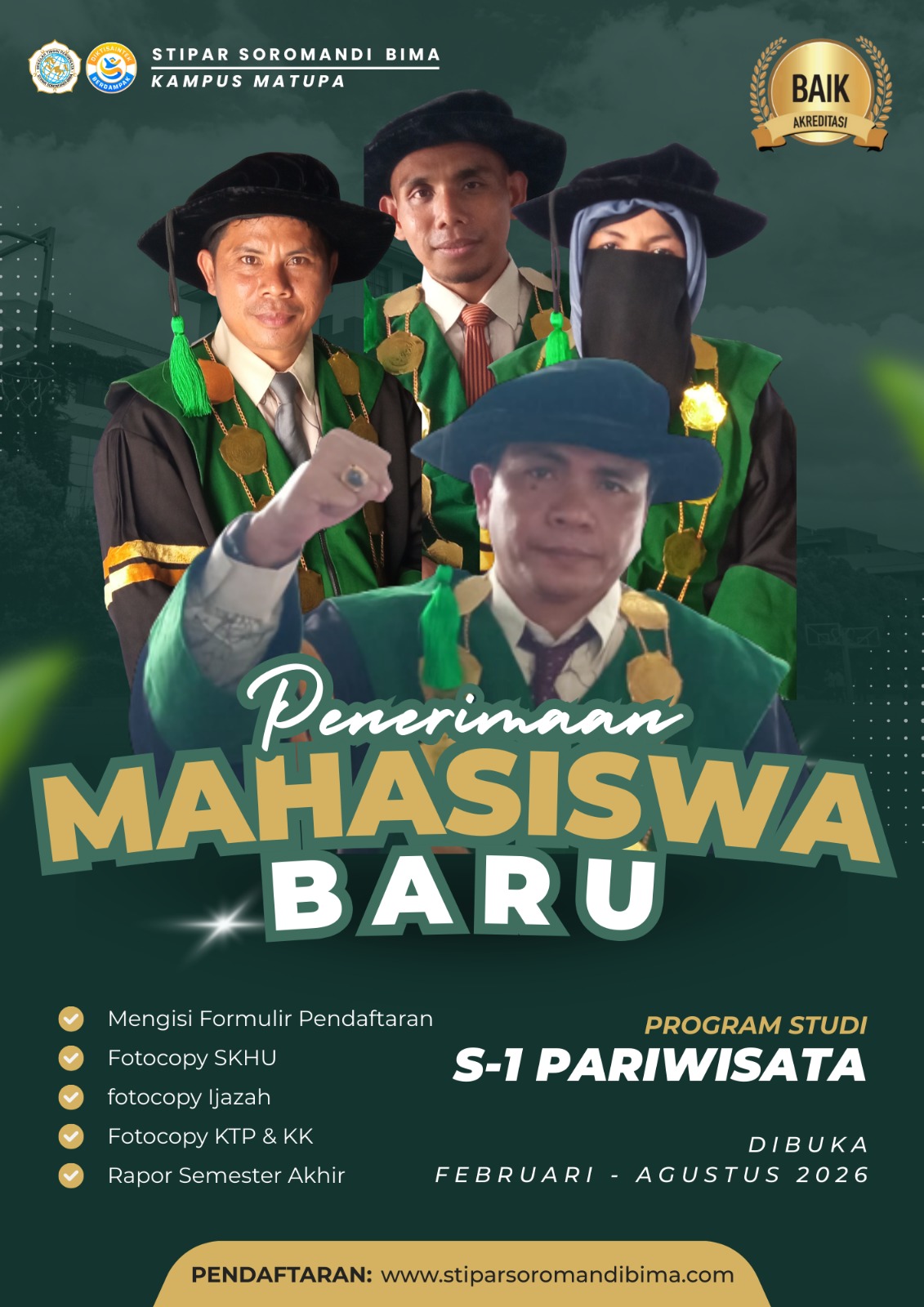 Beranda Advertorial Sekolah Tinggi Pariwisata Soromandi Buka Pendaftaran Mahasiswa, Ini Syaratnya AdvertorialSekolah Tinggi Pariwisata Soromandi Buka Pendaftaran Mahasiswa, Ini SyaratnyaSatria0 min bacaFebruari 19, 2026Februari 19, 2026×Sekolah Tinggi Pariwisata Soromandi Buka Pendaftaran Mahasiswa, Ini SyaratnyaSebarkan artikel ini Pos TerkaitAdvertorialKetua DPC PERADI SAI Mataram: Selamat Hari KartiniAdvertorialPemkab Dompu: Selamat Hari Raya Idul Fitri 1447 HijriahAdvertorialBupati dan Wakil Bupati Bima: Selamat Hari Raya Idul Fitri 1447 HijriahAdvertorialVARINDO LOMBOK INTI: Selamat Idul Fitri 1447 HijriahAdvertorialBang Zul-Bunda Niken: Selamat Idul Fitri 1447 HijriahAdvertorialKetua DPRD NTB: Selamat Idul Fitri 1447 Hijriah